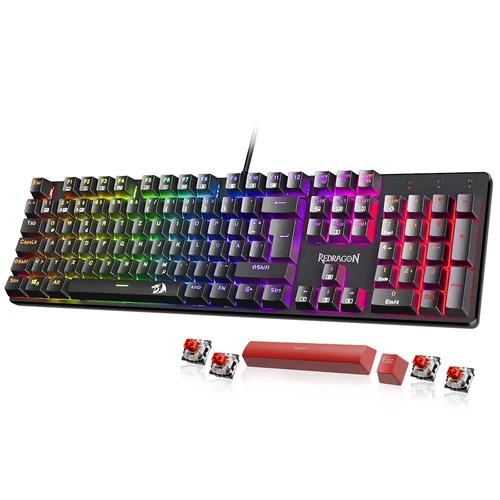 Our K671 gaming keyboard features red switch, which requires less force to press down and the keys feel smoother and easier to use. It’s best for RPGs and MMO, imo games. You will get 4 spare switches and two red keycaps as a gift to diy your own keyboard